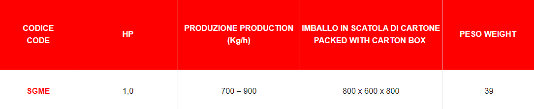 Lo sgranatoio SGME della Ceccato Olindo è una macchina interamente italiana realizzata per un uso domestico e semi-professionale. Monta un motore italiano serigrafato Ceccato Olindo di prima qualità da 1 cavallo (0,75 Kw) e ha una produzione oraria di 700 Kg/h. All?interno dello sgranatoio il rotore è collegato a delle catene che ruotando staccano i grani dal tutolo. Questi, cadendo per gravità, passano attraverso un primo setaccio dai fori larghi arrivando poi ad un secondo setaccio dai fori più piccoli che permette di togliere la pula dal grano. Il tutolo lo si può far uscire alzando il carter. La macchina pesa circa 40 Kg. Lo sgranatoio SGME della Ceccato Olindo rispetta le normative CE sulla sicurezza sul lavoro.
